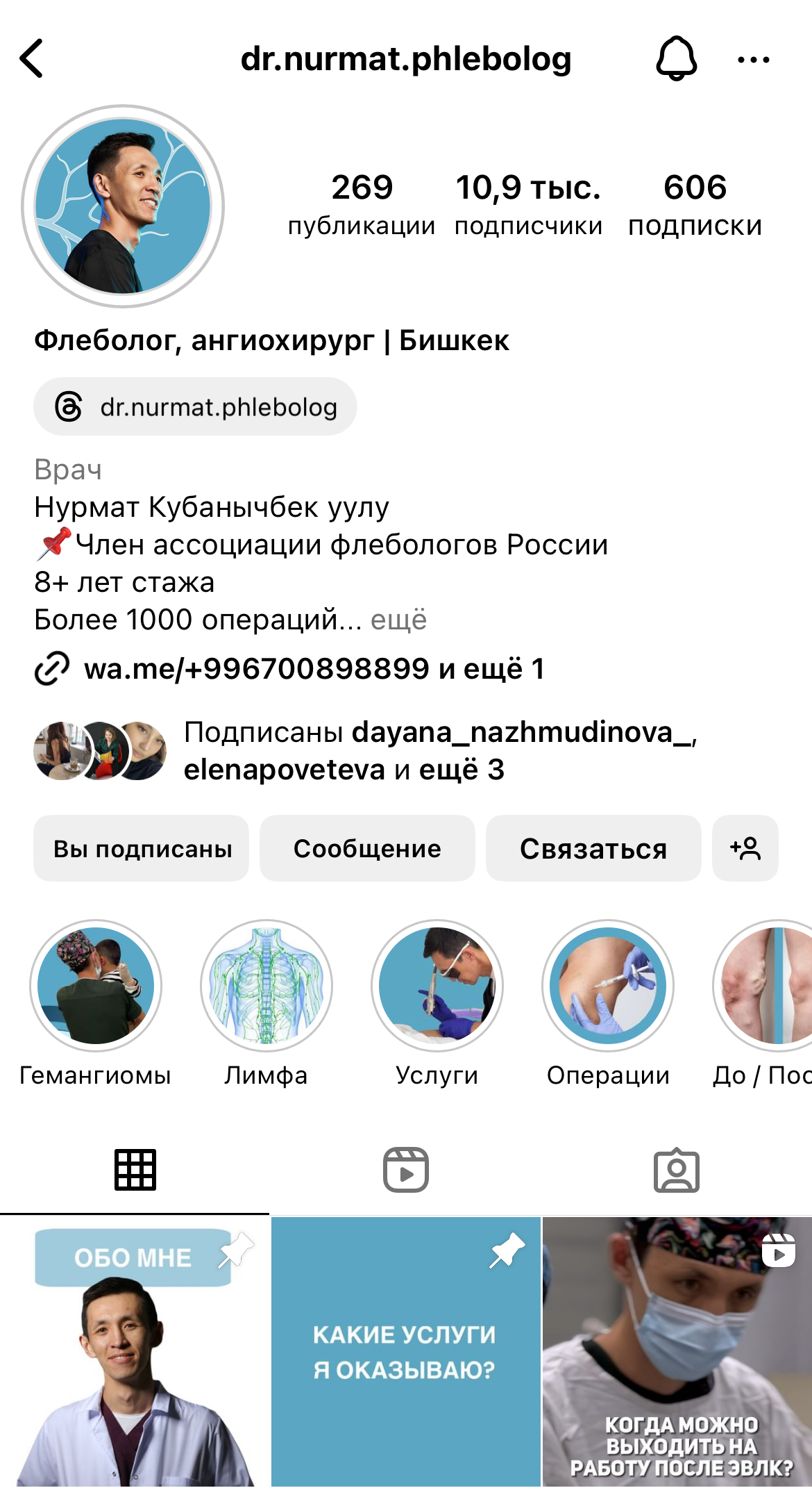 Сосудистый хирург, врач флеболог в Бишкеке. В своей специальности на протяжении 8 лет. За этот период, он провёл уже более 1000 лазерных операций и других операций на сосудах.